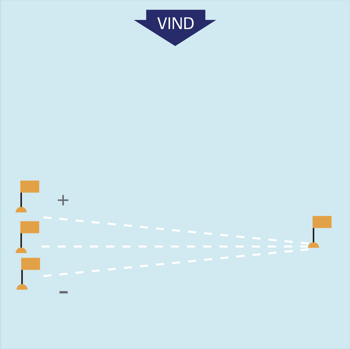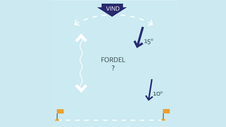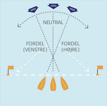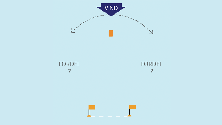 Peg vindøjet (vindretningen) på linjen, og se, hvor vindfordelen er.