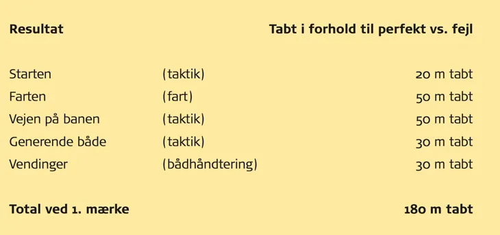 Her ses, hvordan en række fejl i bådhåndtering, fart og taktik tilsammen bliver til et tab på 180 meter, og viser det, man kan kalde Kapsejladsens dna.