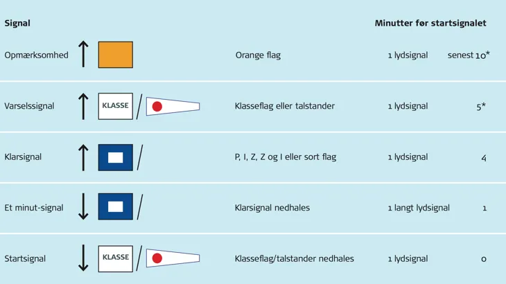 Det er vigtigt at understrege, at tider ALTID regnes fra de synlige flagsignaler. Dvs. at lydsignaler kun er vejledende og i princippet kan mangle eller være forkert afgivet.