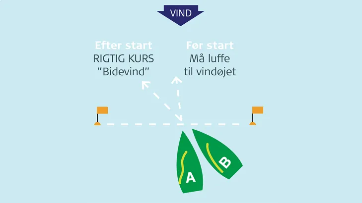Før startsignalet må læ båd (A) gerne luffe luv båd (B) helt op til vindøjet. Efter start skal (A) sejle ”rigtig kurs” (her falde af til bidevind), hvis den tidligere er kommet fra klar agter. Hvis (A) har ligget der hele tiden og (B) er kommet fra klar agter, må (A) godt blive liggende, også efter startsignalet.