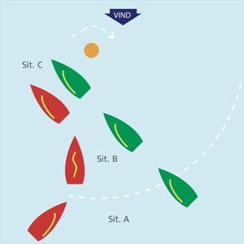 I situation C har rød båd godt nok retten til vejen som læ båd, men skal give grøn båd plads til at runde mærket, da grøn båd er indvendig.