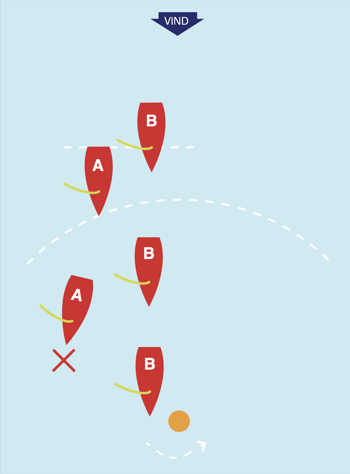 Da første båd (A) rammer zonen, har båd (B) indvendigt overlap, og derfor skal (A) give (B) mærke-plads = sejle til mærket og plads til at sejle 'rigtig kurs' i selve mærkerundingen.