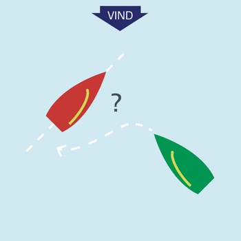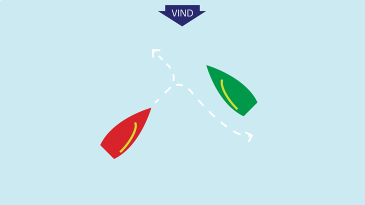 Efter en båd (grøn) har passeret vindøjet, skal den holde klar af andre både, indtil den igen er på bidevindkurs.
