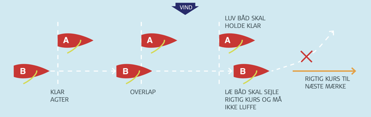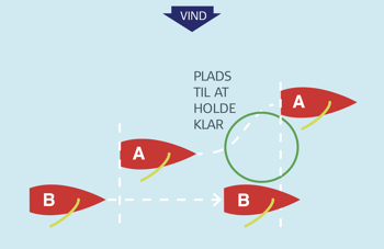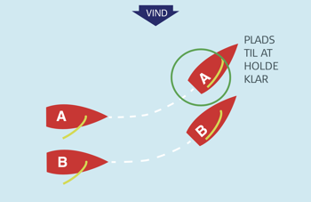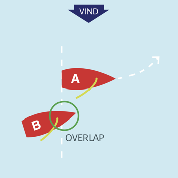 Når både er på samme halse, og der er overlap, skal en luv båd (A) holde klar af en læ båd (B).