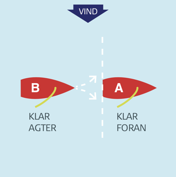 Når både er på samme halse, og der ikke er overlap, skal en båd klar agter (B) holde klar af en båd klar foran (A).