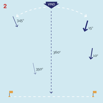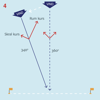 Vinden kan også have en generel drejning. I dette tilfælde 20° til venstre. Ved du det, eller kan du se det på andre både, vejrudsigt elller lignende, skal du søge ud mod vinddrejningen dvs. til venstre.