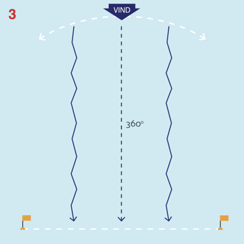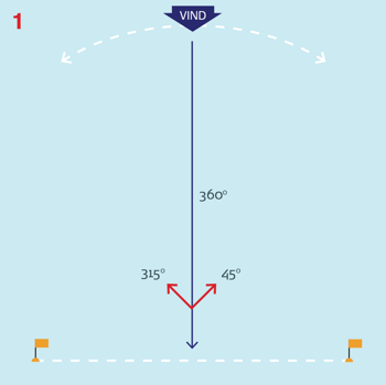 Selvom gennemsnitsvinklen er 360°, kan der sagtens ligge forskellige vindvinkler og vindtryk rundt på banen. Dem kan man finde ved at have været rundt på banen inden start.