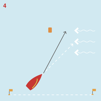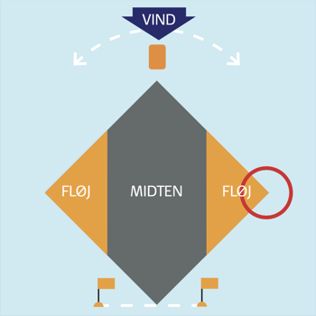 I den røde cirkel helt ude på fløjen vil en vinddrejning til venstre gøre, at du nu er på den forkerte side og har langt til mærket, og en vinddrejning til højre, at du har sejlet for langt og skal falde af til mærket.