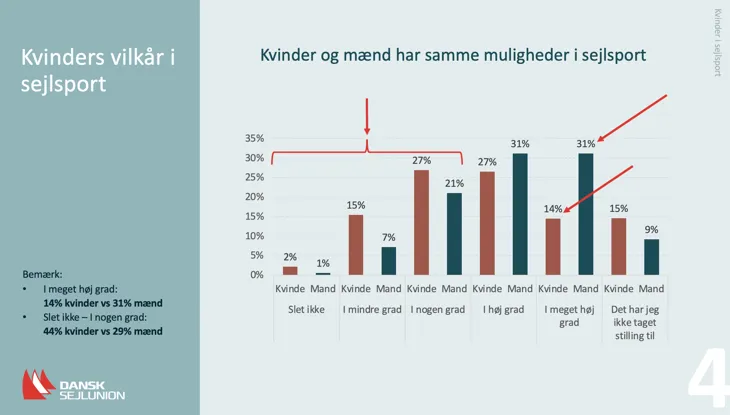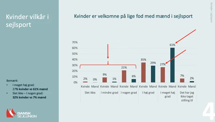 Nogenlunde sådan lyder konklusionen på den undersøgelse, Dansk Sejlunion har gennemført om kvinder i sejlsport i maj 2021, hvor knap 3.000 personer har deltaget. Undersøgelsens konklusioner blev præsenteret på en konference ultimo maj. Omtrent lige mange mænd og kvinder svarede på de mange spørgsmål.