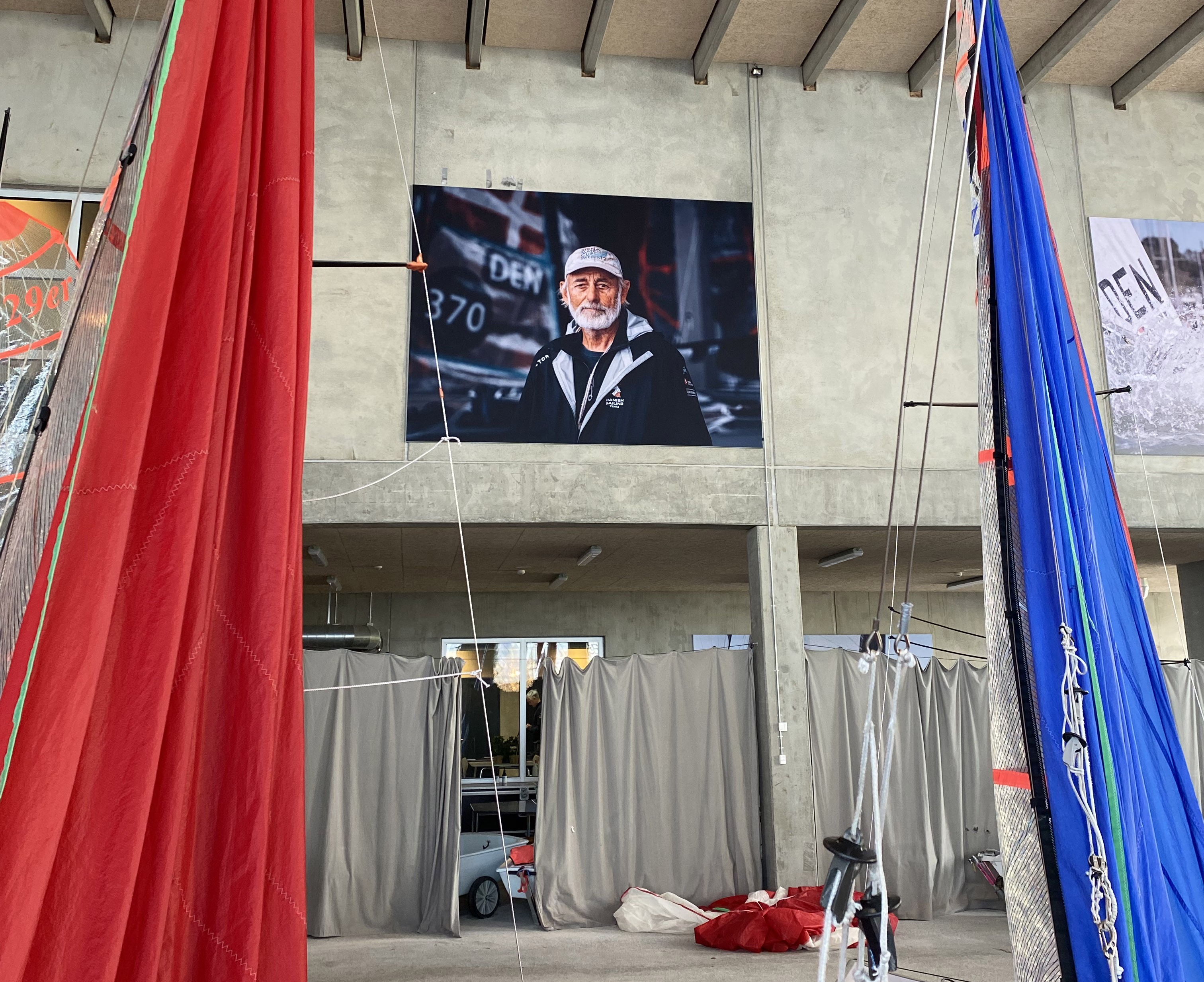 For at hylle Finn 'Beton' Jensens store indsats i det aarhusianske sejlsportsmiljø har Dansk Sejlunion ophængt et stort portræt den afgående træner i sejlsportscenteret.