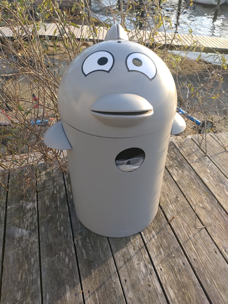 I krabbeklubben har vi fået indkøbt en fin delfinaffaldsspand, som vi har placeret ved vores bro, sådan at alle nu kan komme af med affald, når de nyder en stund ved vandet. Ungerne synes ligefrem, det er sjovt ’at fodre’ delfinen.