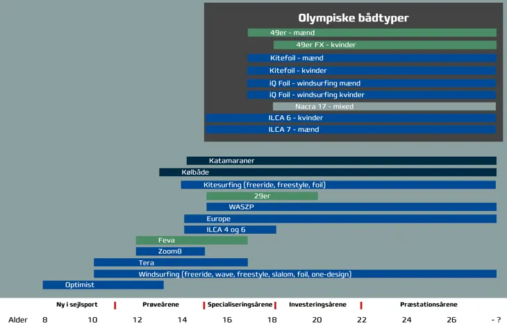 Skemaet giver et vejledende billede af, hvordan en ung sejler kan optimere sine valg af bådtyper i forhold til alder, hvis man ønsker at gøre karriere i olympisk sejlsport.