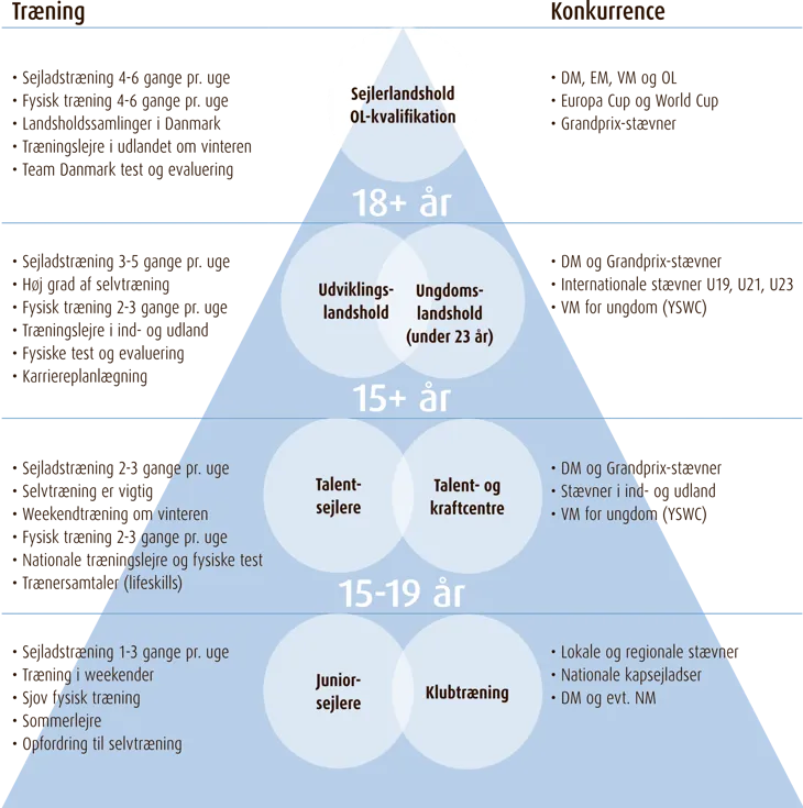 Udviklingspyramiden herunder viser et aldersrelateret forløb på hele turen fra juniorsejler til olympisk klasse. Pyramiden giver et generelt overblik over de træningsmængder og resultatmål, som sejleren skal præstere på forskellige trin undervejs