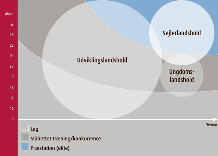 Dansk Sejlunion opererer med tre landshold, hvor balancen mellem leg, målrettet træning/konkurrence og præstation (elite) kan skitseres som i nedenstående model.