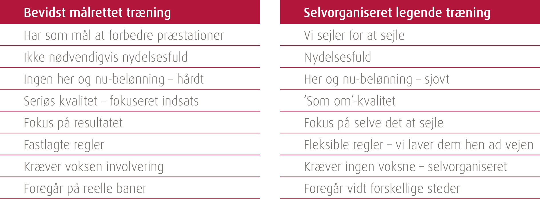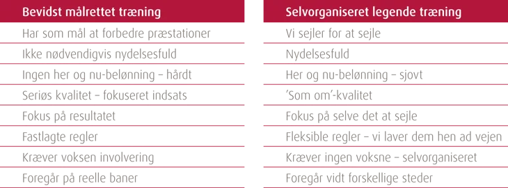 Jean Coté har blandt andet undersøgt udøvere inden for teknisk komplekse idrætter, og han når frem til, at mange timers træning ikke i sig selv er afgørende for, om et talent når et eliteniveau eller ej. Til gengæld konstaterer han, at der er store forskelle i, hvordan udøverne engagerer sig ved siden af den målrettede og trænerstyrede træning. Det viser sig, at eliteudøverne gennem hele forløbet har dyrket en større andel af ”deliberate play” – et begreb, der kan oversættes til ”selvorganiseret legende træning”. Det er træning, som børn og unge selv står for, og hvor de organiserer reglerne på en måde, så legen og glæden er maksimeret. I sejlsport kan det fx være et træningspas, hvor en gruppe sejlere tager ud på egen hånd og laver baner med de ting, der nu en gang er til rådighed – fx et par bøjer og en båd, der ligger for svaj.