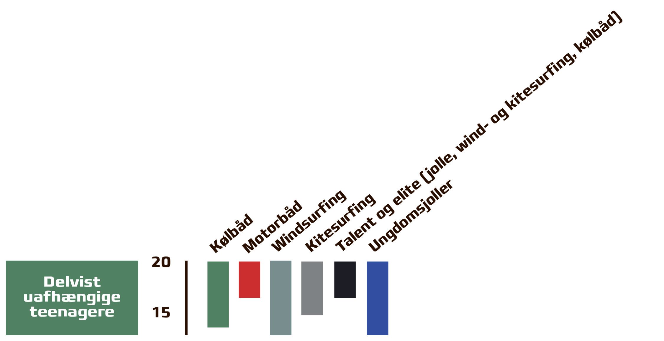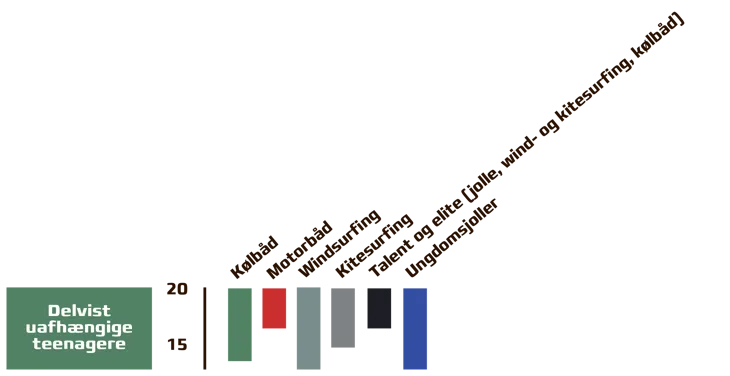 For de fleste i aldersgruppen 13-19 år træder elementet af konkurrence og præstationer mere og mere i baggrunden med alderen, men der er også en gruppe, der er bidt af kapsejlads og for nogles vedkommende endog med ambitiøse mål i talent- og elitemiljøer.