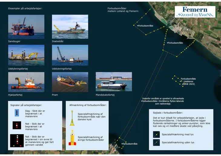 Information for søfarende: Femernforbindelsen har oprettet områder med forbud mod sejlads ud for Rødby. Områderne er forbudszoner, hvor uvedkommende sejlads er forbudt. Dette gælder også fritidssejlads. Områderne skifter løbende i de kommende år. Derfor opfordrer Dansk Sejlunion alle sejlere til at tjekke ruten inden der sejles i området.