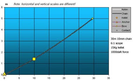 I grafen kan vi se at ankerkæden nu er tot. Den ligner en solid jernstang. Hverken ankervægten eller kædens "catenary" (kædelinje), har nogen signifikant indflydelse på trækvinklen ved ankeret.