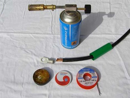 Men, der er en anden metode, der kan anvendes: Man kan lodde kablet på kabelskoen. Men, man kan naturligvis ikke anvende en almindelig loddekolbe til dette. Man bruger en gasbrænder, som vist. Som loddetin vælges den type som er uden flusmiddel, og som er en del kraftigere end det loddetin, som normalt benyttes til mindre stik o.a. Men, det er nødvendigt med et flusmiddel, dette købes i små dåser.