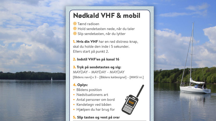 SejlSikkert har lavet et klistermærke med trin-for-trin instruktioner i, hvordan du foretager et nødopkald. Klistermærket kan placeres tæt ved radioen. Hør din sejlklub om de har et, ellers kan du selv bestille et hos dem.