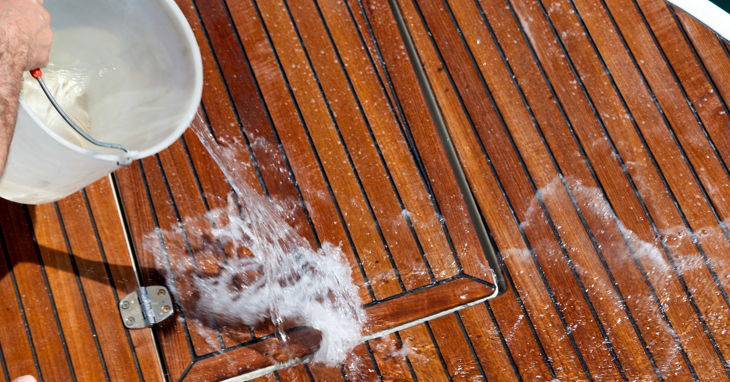 Når du har fjernet støv og skidt, skal du nu til at rengøre dækket med enten mild sæbe blandet i vand eller med et rengøringsmiddel lavet særligt til bådrens. Du skal påføre din sæbeblanding med en børste eller en svamp og sørge for, at du kommer i alle kroge og hjørner.