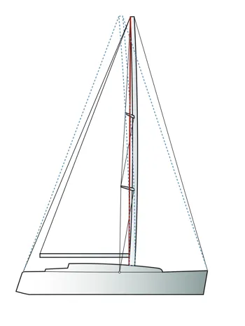 Det er forstagets længde og mastefodens placering, der sætter mastens hældning, og du kan trimme mastehældningen ved at flytte mastefoden og ved at forlænge eller forkorte forstaget.