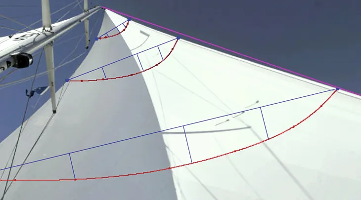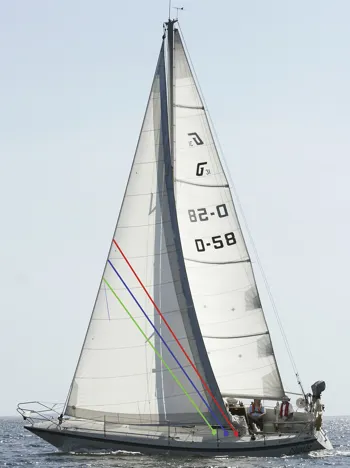Her er samme sejl og trim – set nede fra fordækket. Det ses tydeligt, hvordan sejlet twister korrekt. De røde kurver viser et sejls optimale fuglevingefacon.