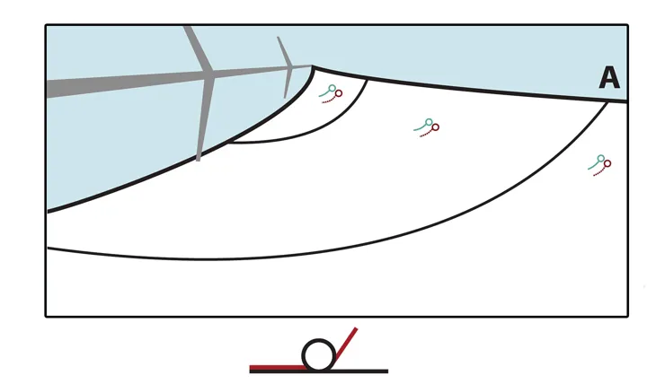 Her til er genuaen trimmet optimalt (A), og de tre sæt ticklers i sejlet blafrer alle fint og parallelt.