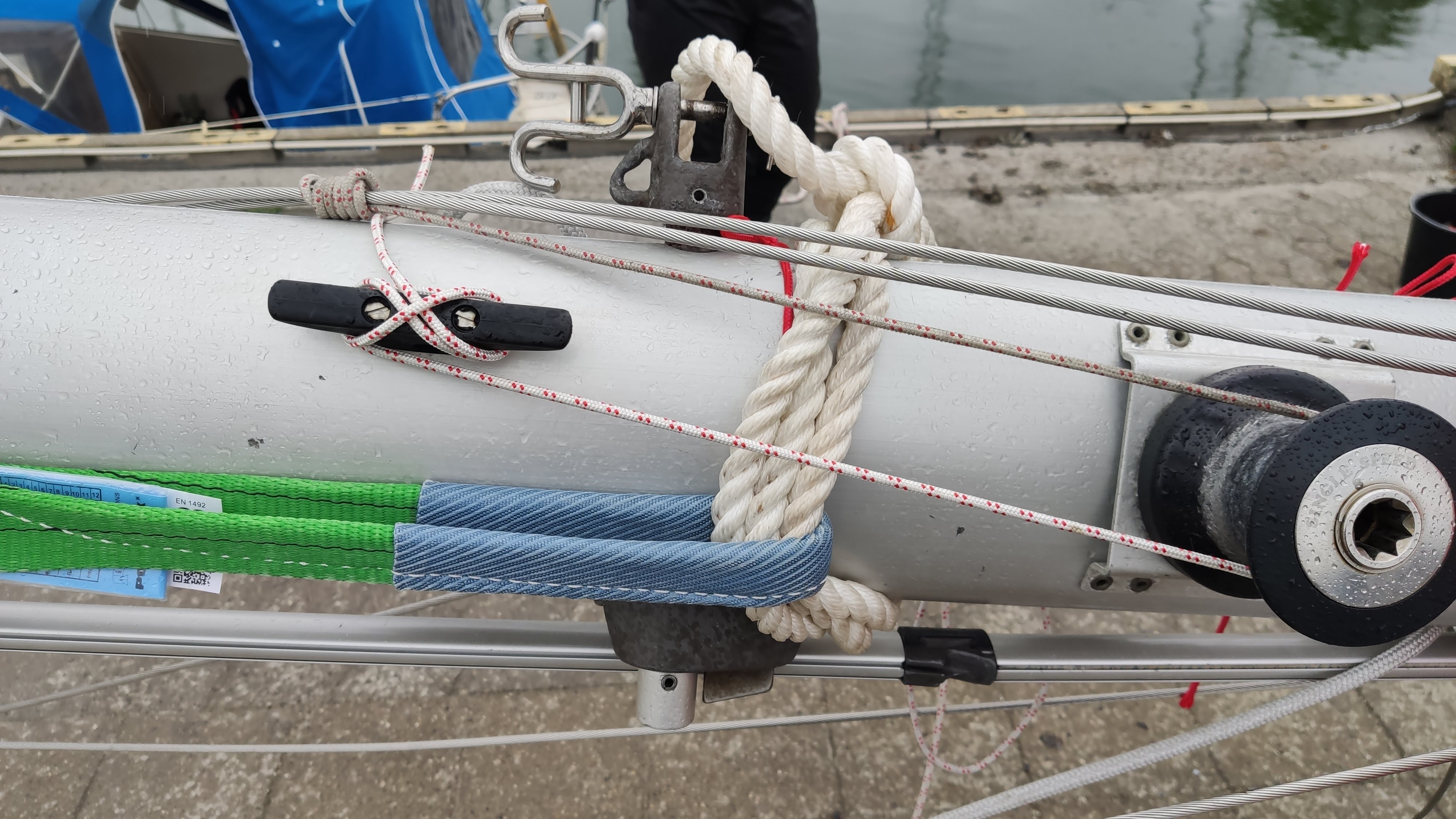 Stroppen er lagt om masten og sallingshornene fungerer som løftepunkt.