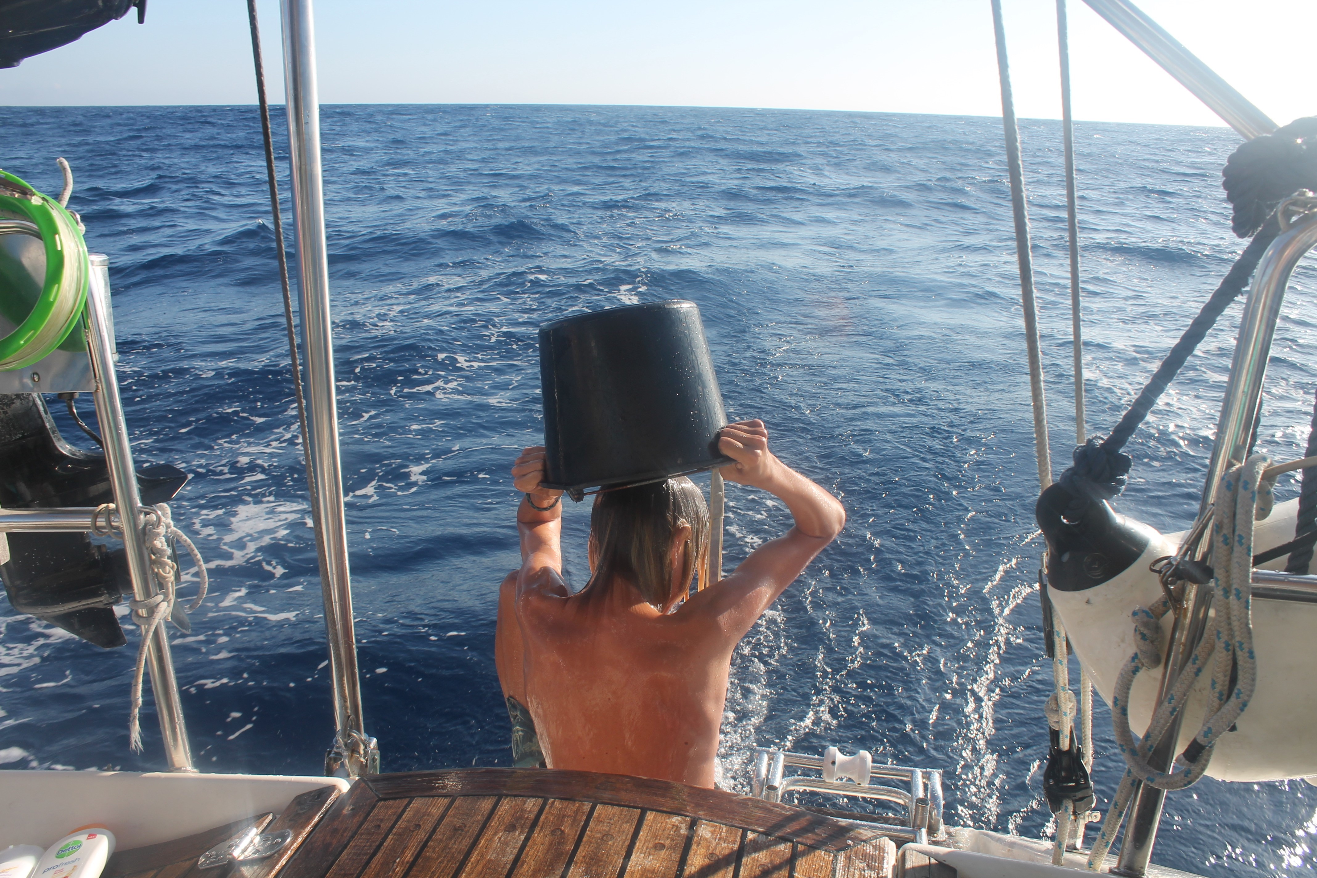 Vores ældste søn tager et bad midt på Atlanterhavet.