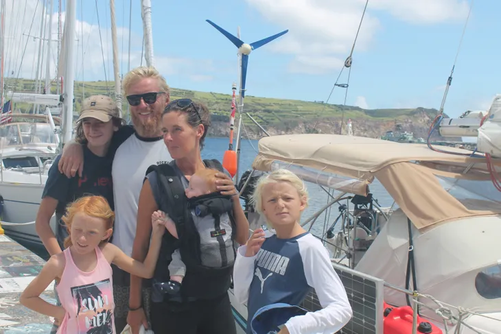 Vi krydsede Atlanterhavet i 2018 fra Bahamas til Azorerne. Et stræk på knap 3000 sømil. Det tog os 21 dage med et nødstop på Bermuda pga defekt autopilot. “Vi” er i denne fortælling vores lille familie. Udover mig selv består min familie af min mand og skipper, Christian, vores ældste søn Gustav på 16 år, Bertram som fyldte 12 midt på Atlanterhavet, Liva på otte år og lille Sylvester på to måneder. Sylvester blev født på St. Martin i Caribien. Han flyttede ombord på båden, da han var en dag gammel og sejlede sit første lange stræk på ca 200 sømil, da han var en måned gammel.