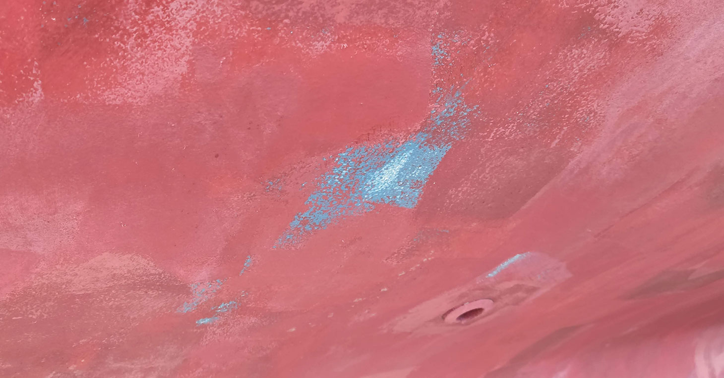 Når det er klaret, og båden er tør, går du bunden efter. De steder, hvor de yderste lag bundmaling er poleret af, vil du kunne se den blå farve. Nu kan du nøjes med at pletmale der, hvor den blå farve kan ses. Alle de steder, hvor der stadig er rødt, undlader du at male. På denne måde sikrer du, at der er tilstrækkelig bundmaling til at beskytte bunden, men undgår, at der opbygges mange lag af maling. Når du har pletmalet, er båden klar til at komme i vandet igen.