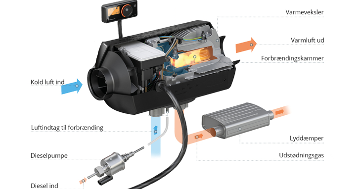 Foto: Eberspacher.comPå illustrationen herover kan du se et overblik over installationen på en større sejlbåd. Dieselfyret sidder i en luge agter og herfra fordeles den varme luft i båden via brede slanger. På lidt mindre både er der ofte bare en enkelt slange ledt til salonen og måske en til spidskøjen. Fyret suger diesel direkte fra tanken og udstødningen går gennem skroget på agterspejlet med en særlig varmeisoleret skroggennemføring.